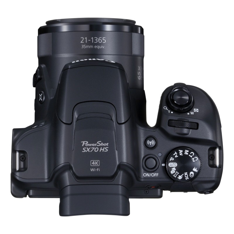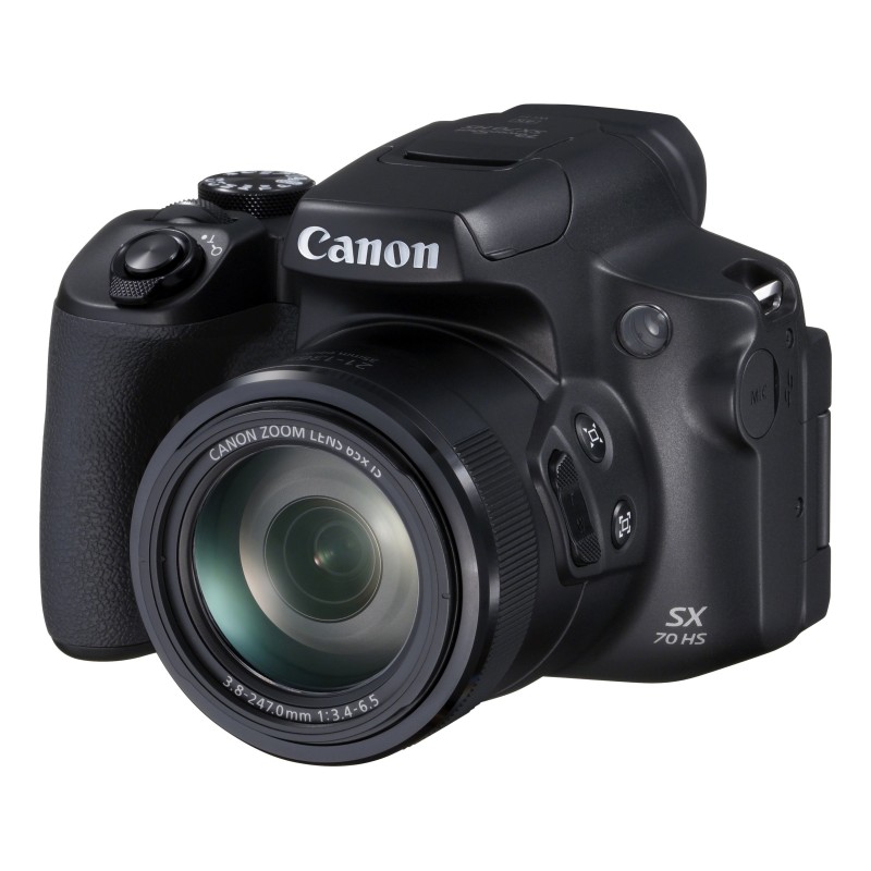 Canon PowerShot SX70 HS. Tipologia fotocamera: Fotocamera Bridge, Megapixel: 20,3 MP, Dimensione del sensore di immagine: 1/2.3", Tipo sensore: CMOS, Risoluzione massima immagine: 5184 x 3888 Pixel. Sensibilità ISO (max): 3200. Zoom ottico: 65x, Zoom digitale: 4x. Wi-Fi. Tipologia HD: 4K Ultra HD, Risoluzione massima video: 3840 x 2160 Pixel. Dimensioni diagonale schermo: 7,62 cm (3"). PictBridge. Peso: 610 g. Colore del prodotto: Nero